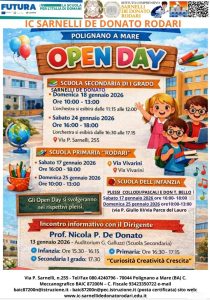 Si comunica che MARTEDI’ 13 GENNAIO 2026, nell’Auditorium “G. Galluzzi” della Scuola Secondaria di primo grado “Sarnelli De Donato” (via P. Sarnelli 255), il Dirigente scolastico, prof. Nicola P. De Donato, incontrerà i genitori degli alunni interessati all’iscrizione dei propri figli alla scuola dell’infanzia, alla primaria e alla media, secondo il calendario di seguito indicato: